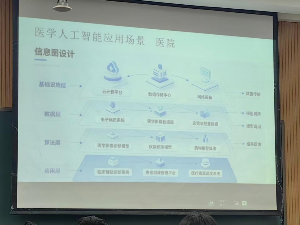 符维思经理通过“医学人工智能四层架构图”,系统拆解了AI医疗的底层逻辑。他指出,医学AI是由基础设施、数据、算法、应用层层支撑的复杂生态,并结合医院、医药企业等应用场景,生动解析AI赋能医疗全流程:
