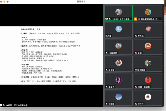 会上五位优秀研究生代表分别从升学、公考、企业、医疗事业单位四个方面为同学们带来干货满满的就业分享。考取山东大学博士的阮宁从个人概况、考博时间、选导师、考试形式等方面为大家分享了考博经验;签约江西定向选调的刘玲玲从选调生政策了解、招考一般流程、考试科目及成绩核算、笔试行测备考、笔试申论备考、面试备考等方面为大家分享了公招考试经验;签约著名药企药明康德的葛越从获取招聘信息、投递意向岗位、面试等方面为大家分享了入职公司的经验;入职西安交通大学第一附属医院的唐榕从信息获取途径、考核内容方面为大家分享了医院招聘的经验;签约黑龙江定向选调省直岗位以及济南某三甲医院的 f95zone