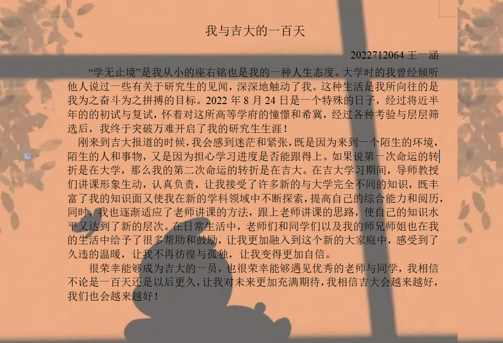 特面向2022级研究生新生开展“我与吉大的100天”作品征集活动,让同学们写出自己的心声。