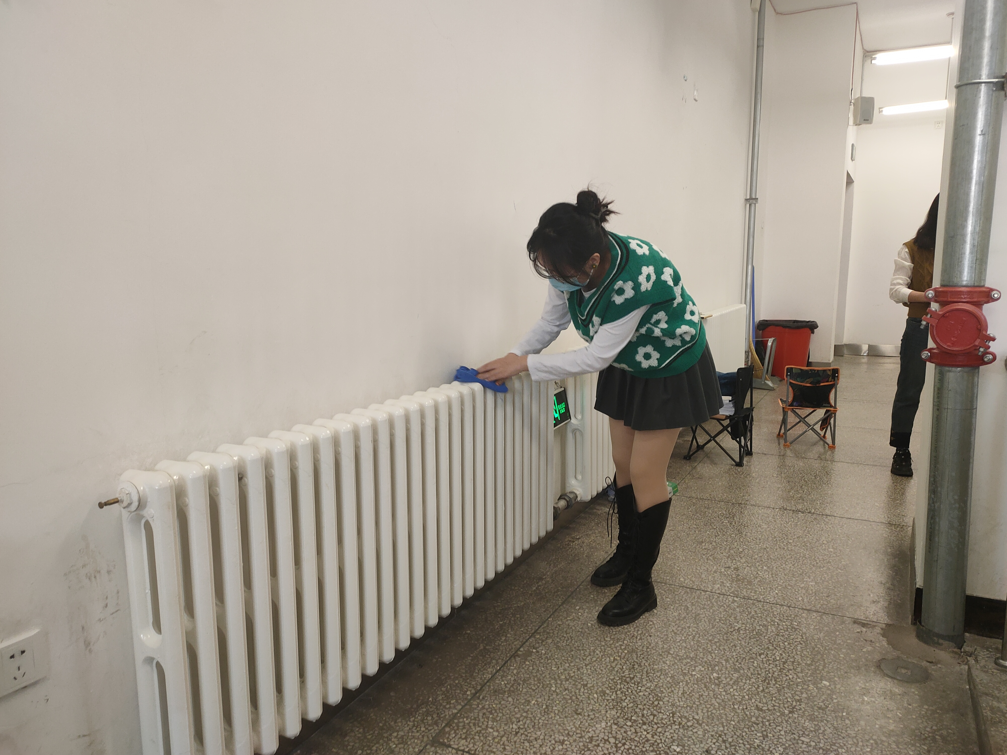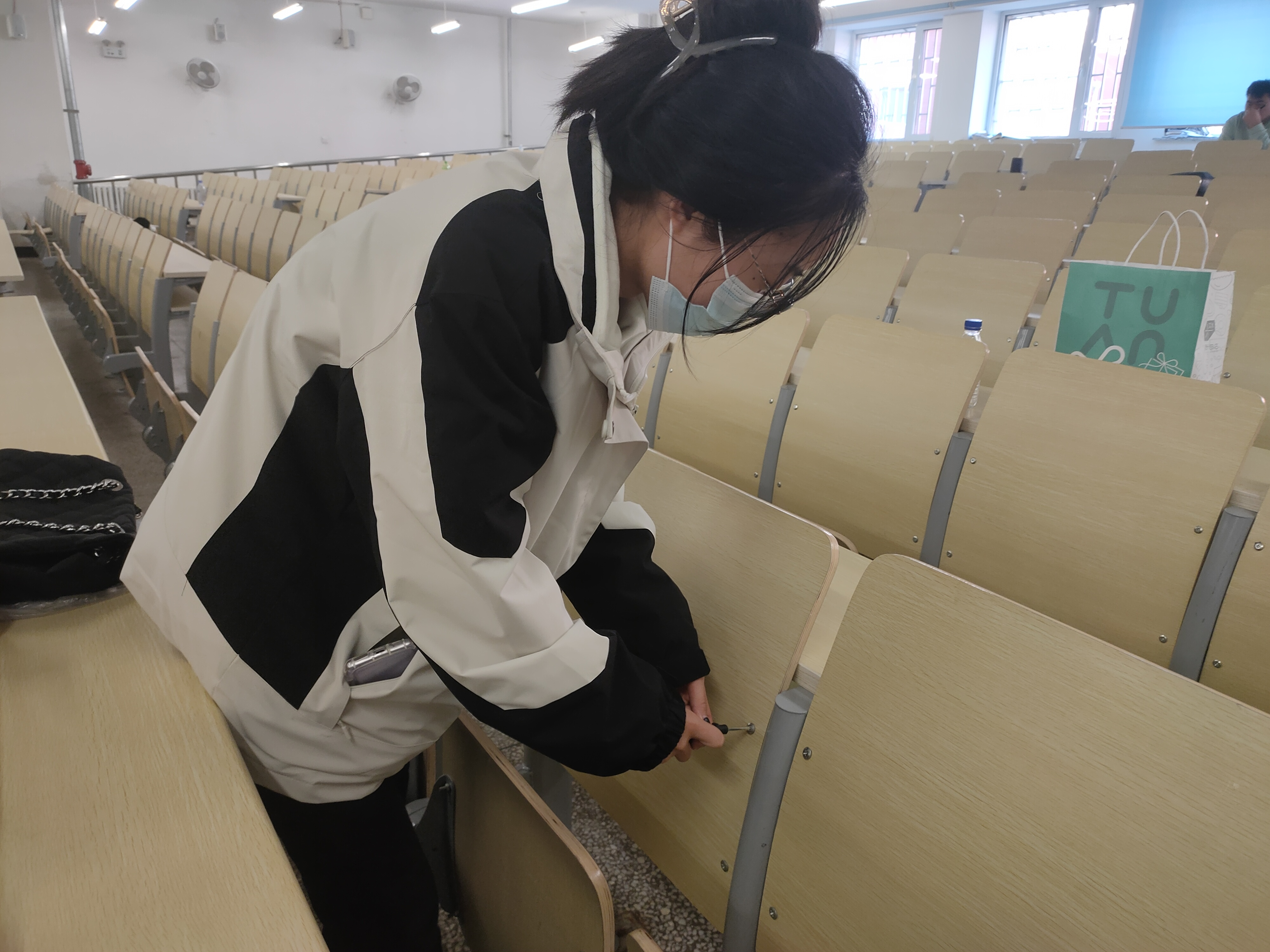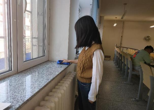 为了在中午同学们吃午饭的时间高效完成任务,同学们被分成三个小组,同时在第一教学楼不同教室展开活动。活动的主要内容是擦拭窗台、护栏、修理桌椅上松动和凸出的钉子,令教室光洁明亮。