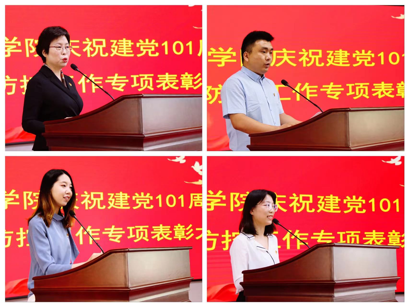 线上授课教师代表王医术老师、驻院教师代表王国强老师、孙佳钰老师、学生党员代表张丹同学分别发言。王医术老师作为学院线上授课教师杰出代表,分享了她这段时间以来工作的感悟与感动,表达了她对学院全体教师克服困难,顺利完成线上授课的敬意以及身为基础人的骄傲与自豪;王国强老师克服家庭负担重的困难,留守学院八十余天,负责实验室液氮罐灌装等各类工作;孙佳钰老师驻守学生宿舍七十余天,与9个学院480余名学生同吃同住,确保了师生安全。