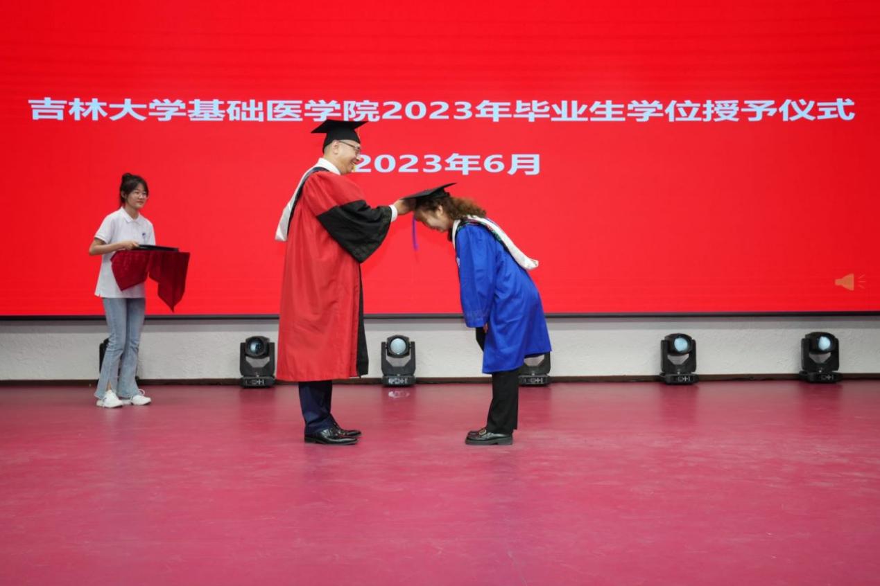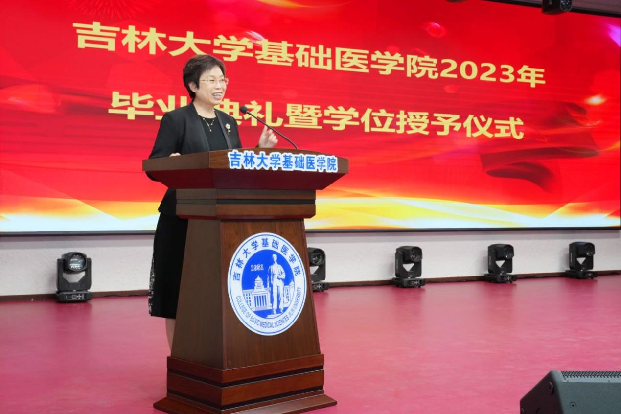 研究生毕业生代表李佳昕发言,感谢学院优秀的师资、良好的科研条件、浓郁的学术氛围,感恩每位老师的精心栽培,代表全体毕业生郑重承诺会传承弘扬白求恩精神,秉持热爱、执着前行,承担起祖国赋予我们的使命,收获无悔的精彩人生!