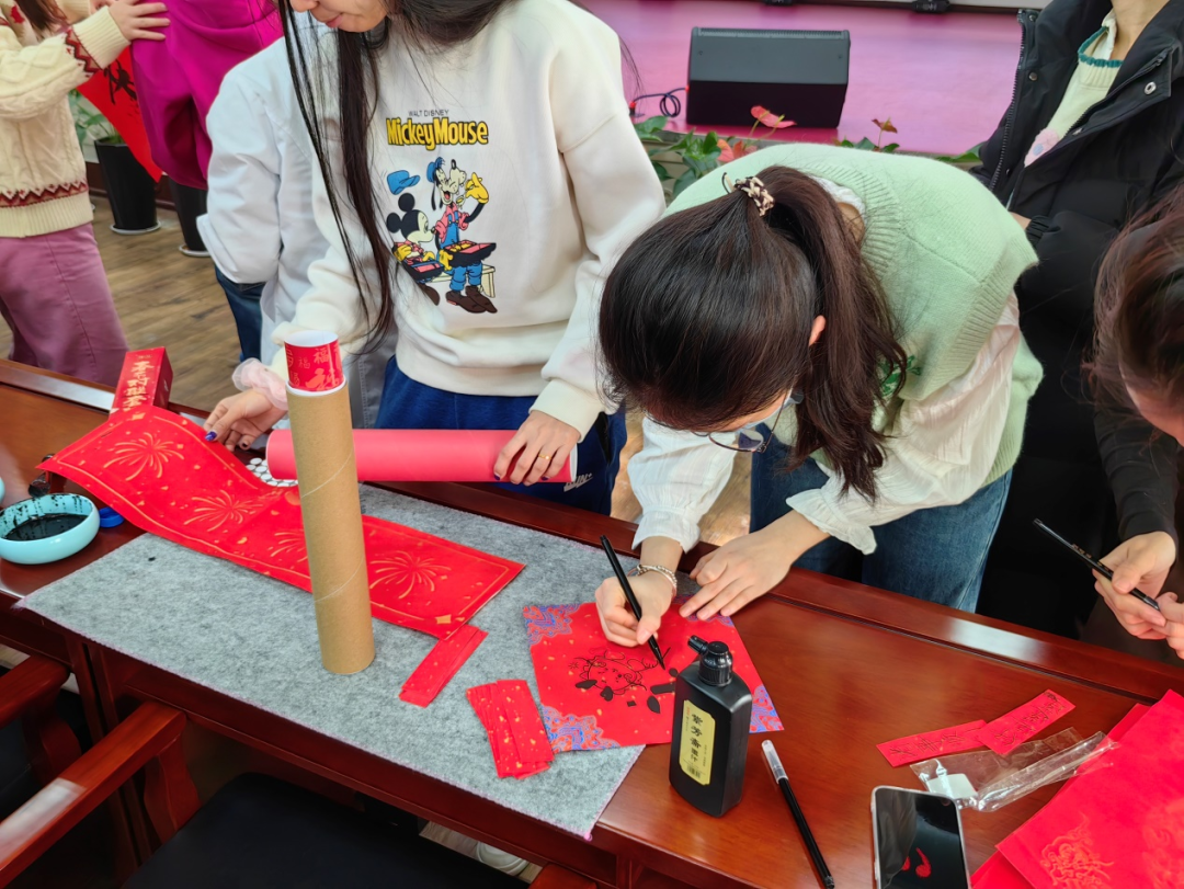 于1月25日在二楼报告厅开展“笔墨龙飞 红联贺春”写春联、送祝福活动,师生们齐聚一堂,提笔书写浓浓的新春祝福。