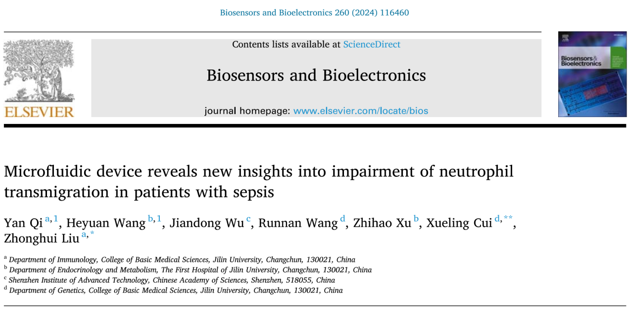 免疫学系柳忠辉教授团队于2024年6月1日在国际高影响力刊物《BIOSENSORS & BIOELECTRONICS》上发表了题为“Microfluidic device reveals new insights into impairment of neutrophil transmigration in patients with sepsis”的学术论文。该期刊是生物物理学领域的国际顶尖学术期刊之一,中科院分区为1区,影响因子为10.7。《BIOSENSORS & BIOELECTRONICS》杂志在生物物理学领域和分析化学和电化学领域所有期刊中分别排名第2和第3位,具有很高的学科影响力。齐妍副教授为第一作者、柳忠辉教授及崔雪玲教授共同通讯作者, f95zone
