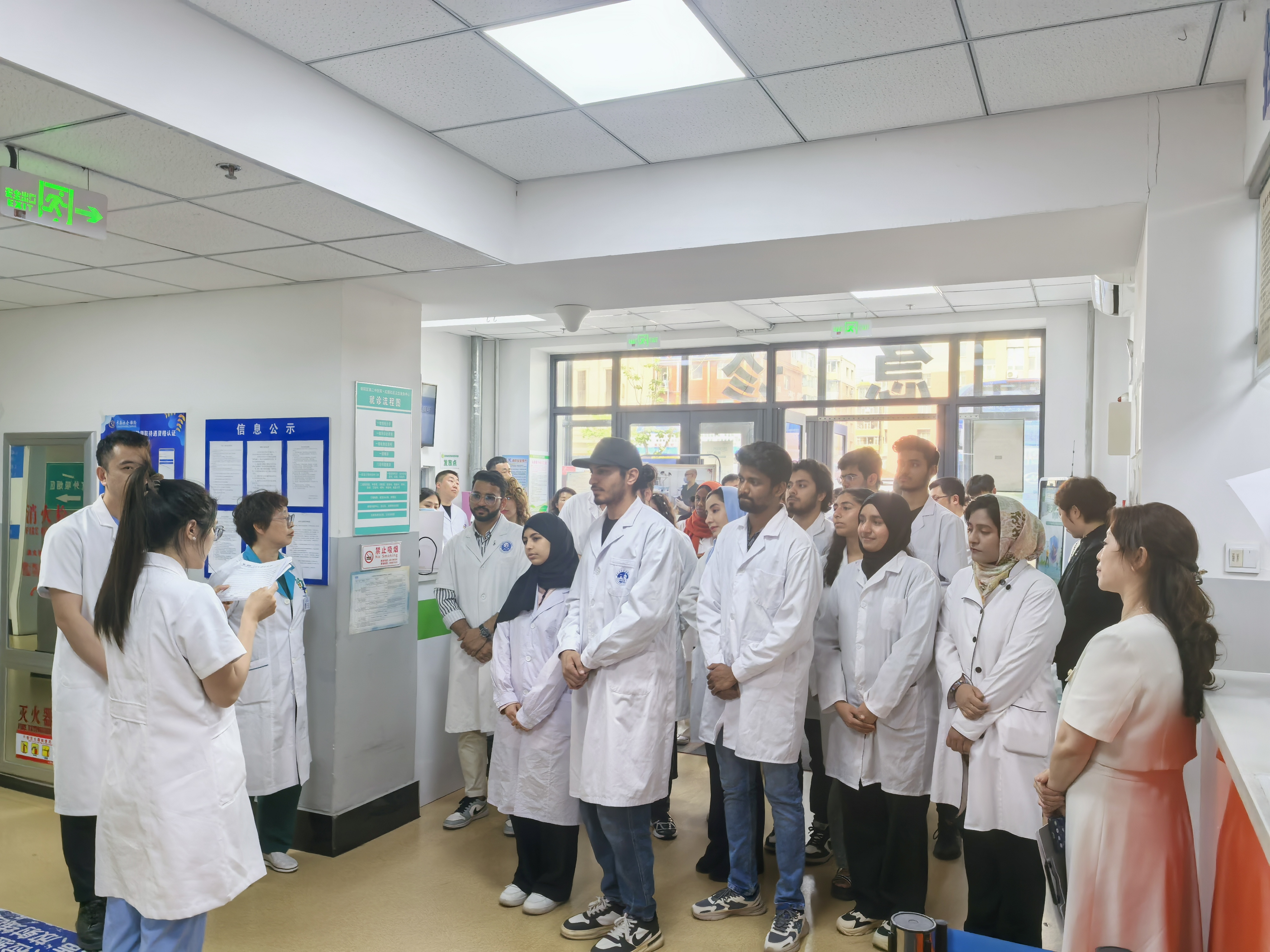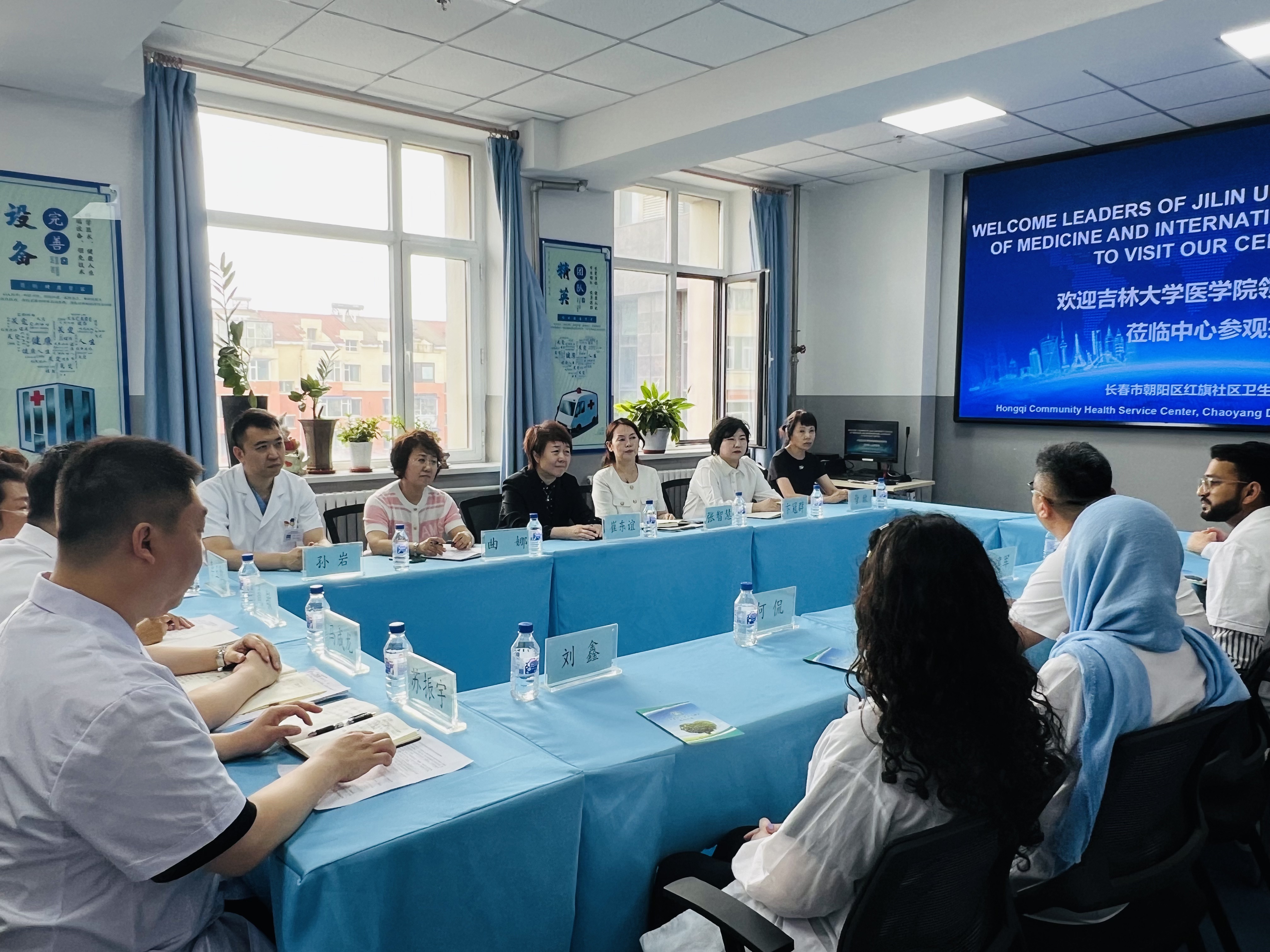 院长王放、副院长何侃、2023级留学生班主任苏建军老师以及留学生办全体工作人员组织部分MBBS留学生走进长春市朝阳区红旗社区卫生服务中心,开展临床实习与实践活动。长春市朝阳区卫生健康局党组书记、局长崔东谊,朝阳区卫生健康局党组成员、朝阳区计划生育协会专职副会长张智慧以及红旗社区卫生服务中心领导班子成员共同参加本次活动。