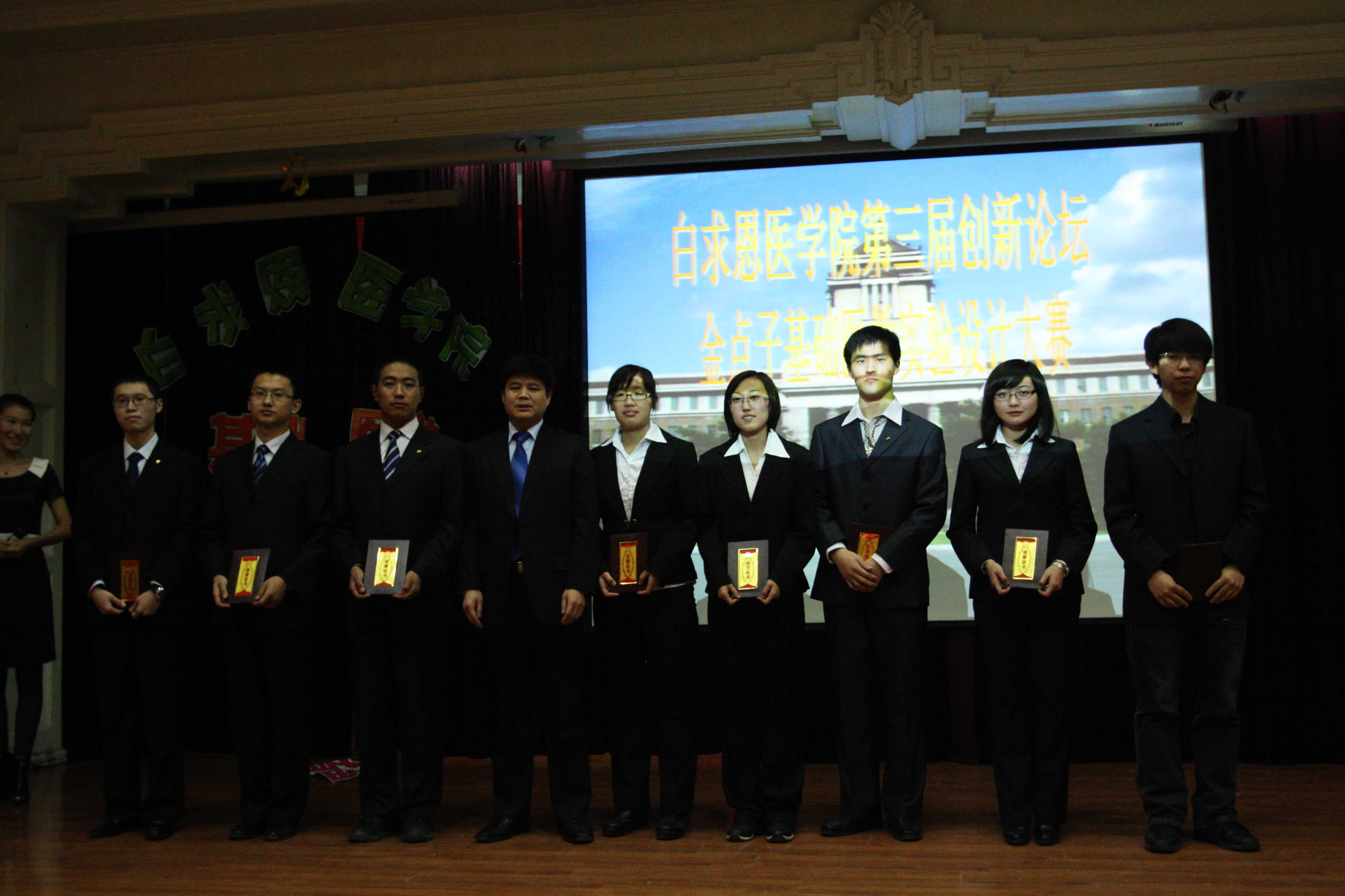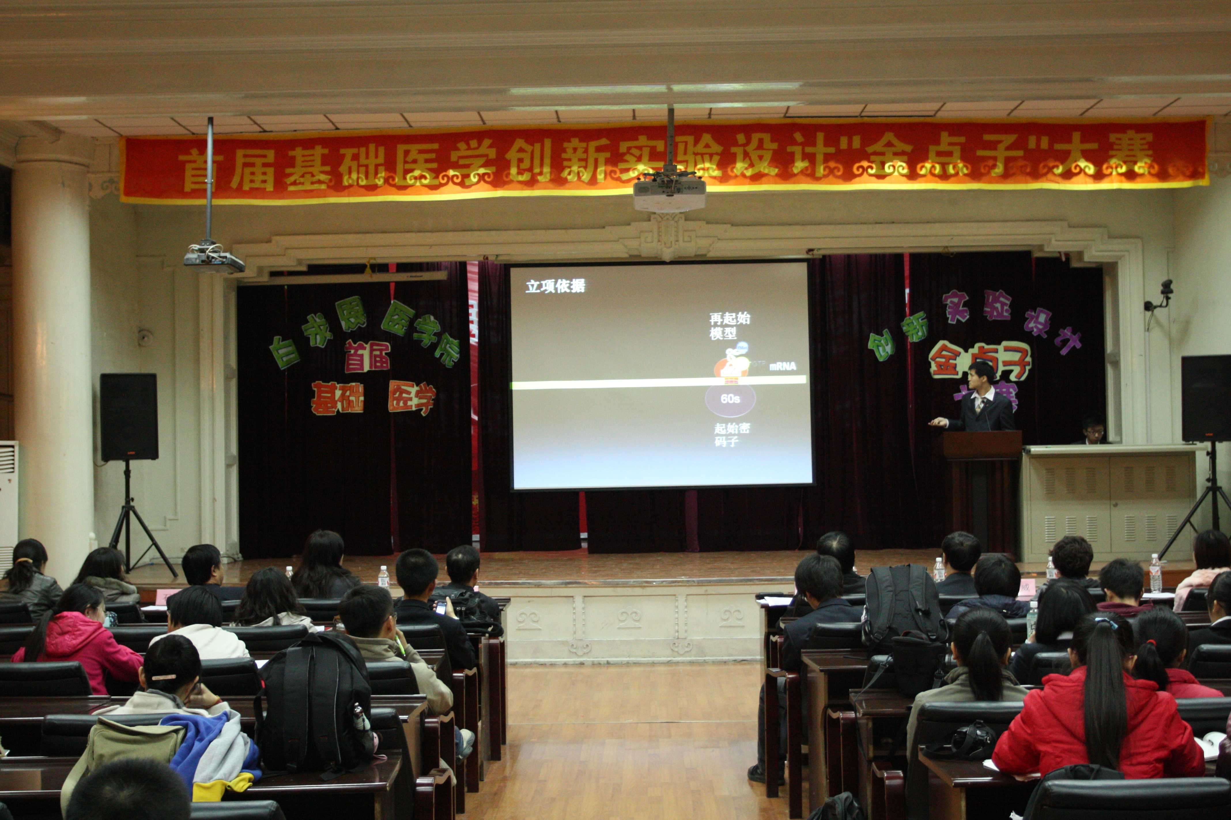 本次大赛采取课题汇报的形式,每项课题从基本原理、创新点、可行性及实用价值角度进行阐述。参赛团队课题包括:“过度内质网应激下ATF4表达下调的可能及其机制”、“铅与千寻——铅中毒防治与建立校际合作联盟”、“自动手术缝合器械”、“新型人造骨纳米结构材料——以DNA为模板矿化花状硫化铅纳米结构材料的制备”、“RIP1和PARP在LPS诱导PC12细胞自噬中作用的研究”、“大肠杆菌麦芽糖结合蛋白(MBP)诱导小鼠Th1细胞的活化作用及其机制研究”、“CCK在胃转流术后的变化及术后对Ⅱ型糖尿病的影响”、“精氨酸糖苷(AFG)对Ⅰ型糖尿病大鼠降糖作用及其机制的研究”。课题研究方向涉及免疫学、药理学等多学科,注重医学问题与社会生活实际相结合。在全体选手报告结束后,白求恩医学院院长助理陈霞教授等五位评审专家对选手做出了综合点评。最终,来自09级临床医学五年制的李韬所在的课题组荣获大赛一等奖。