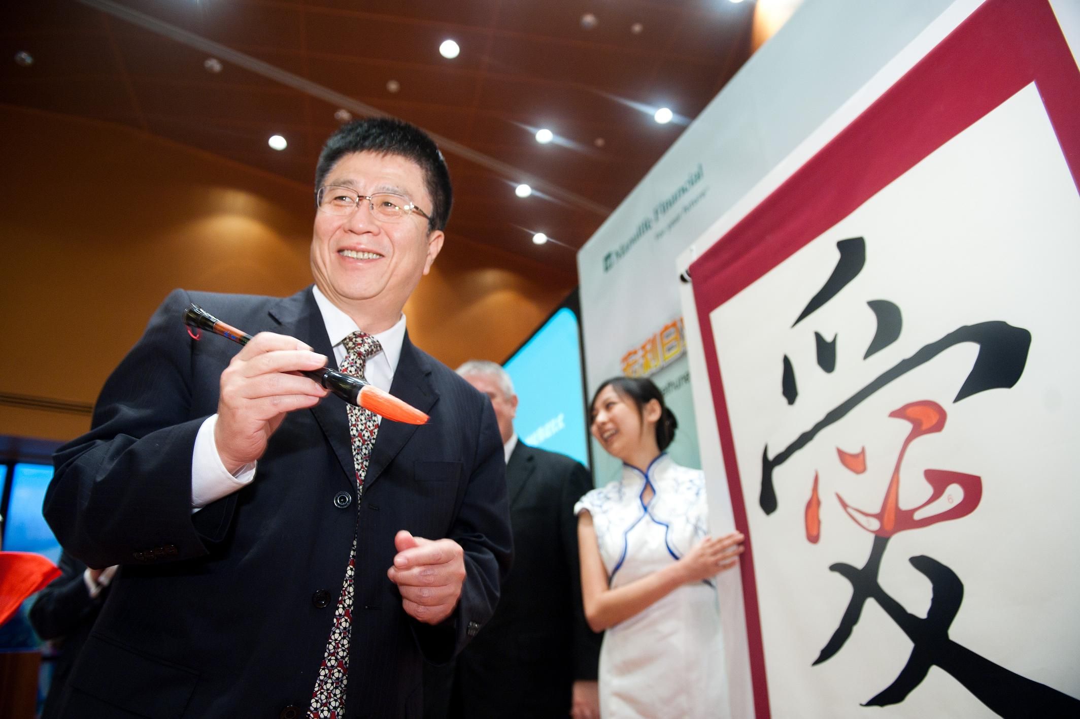 副校长王冠军、白求恩医学院党委书记屈英和等出席了仪式。仪式上,副校长王冠军与加拿大大使馆公使南杰瑞、宏利金融董事长Ms.Gail Cook-bennett、宏利金融总裁兼首席执行官邓广能等进行了亲切的交流,并共同书写中国字“爱”,标志着“宏利白求恩基金”的成立。