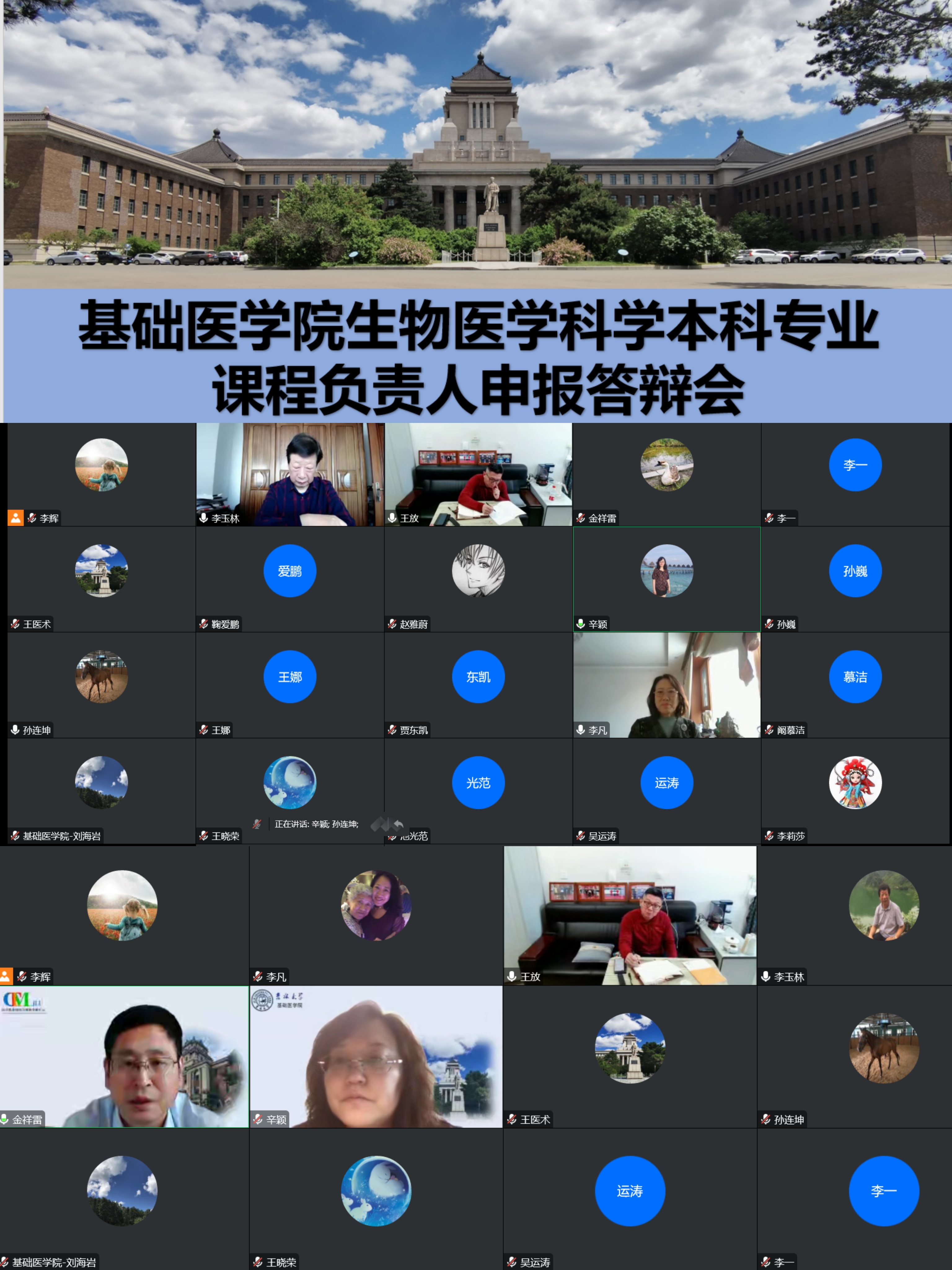 院长孙连坤教授,院长王放教授、王晓荣书记、副院长刘海岩教授、孙巍教授,学院教学委员会主任委员王医术教授以及医学督导专家组李一教授等担任专家组评委,会议由学院教学副院长辛颖教授主持。