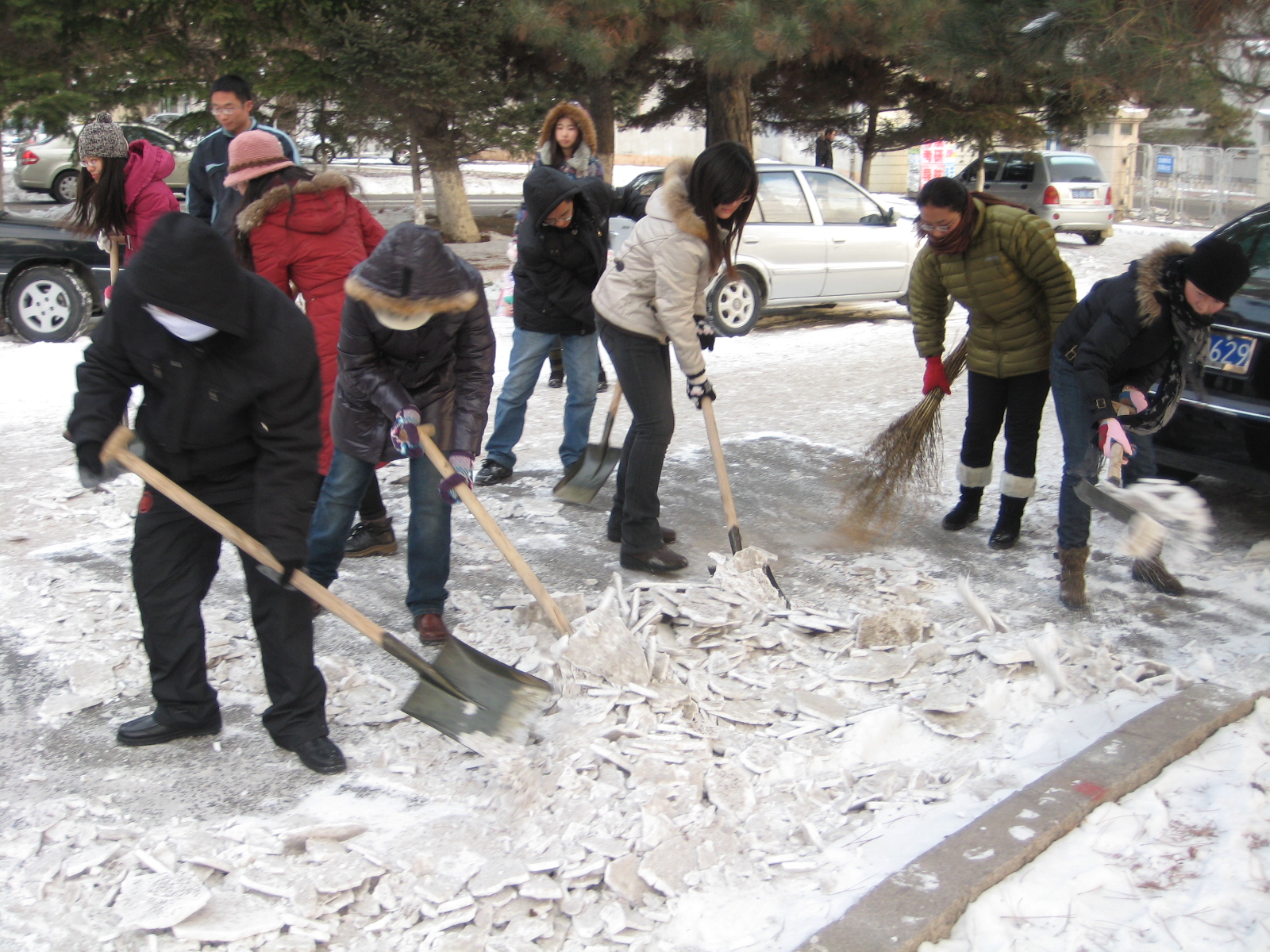虽然天气很冷,地面很滑,但是同学们顶着寒风,挥舞着铁锹、扫帚,积极投入到了扫雪“攻坚战”中。同学们相互帮助,互相支持,工具不够,大家都争着去铲雪。经过两个小时的艰苦奋战,基础楼前露出了黑色的柏油路面,道路终于畅通了。看见师生陆续的走在安全的路面上,同学们露出了开心的笑容。