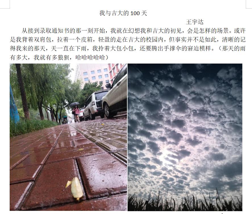活动通过线上向同学们征集以“我与吉大的100天”主题为的优秀作品。征集的稿件的形式可以是文字也可以是图集,主要是记录自己入学以来的心路历程,心理变化,以及在学校生活的点点滴滴。活动一经发布,同学们都积极响应并提交了大量的优秀作品。最后经学院评定确定了一等奖、二等奖、三等奖和优秀奖的获奖名单,同时准备了奖品奖励积极参加活动的同学。