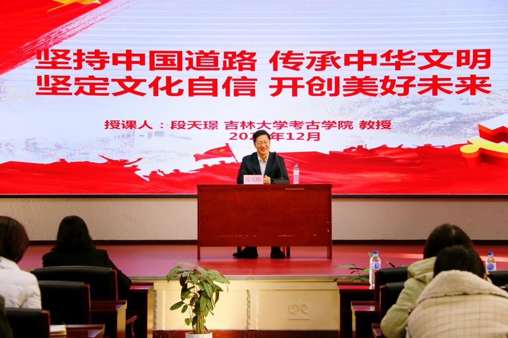 考古学院副院长、博士生导师段天璟教授为学院做了一场题为“坚持中国道路,传承中华文明,坚定文化自信,开创美好未来”的专题党课。报告会由学院党委书记王晓荣主持,学院领导班子成员、中层干部及师生党员共计一百余人参加了本次党课学习。