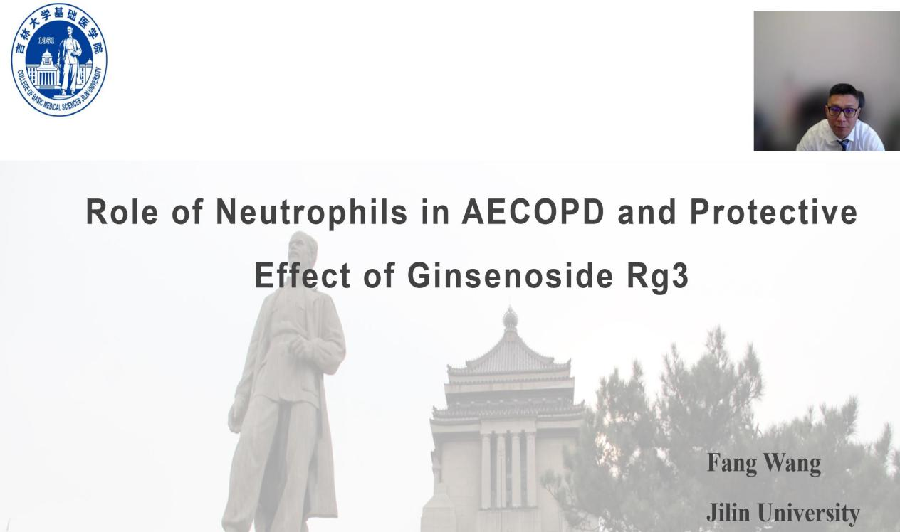 王放教授受邀参加,并在线上做了题为“中性粒细胞在AECOPD发生中的作用及人参皂苷Rg3的保护机制研究”报告,介绍了人参皂苷Rg3能够通过抑制中性粒细胞PI3K信号通路的激活,从而减轻AECOPD中性粒细胞增多引起的炎症反应,提示人参皂苷Rg3具有开发为防治AECOPD药物的潜力,此项研究对攻克慢性阻塞性肺疾病产生积极的影响。