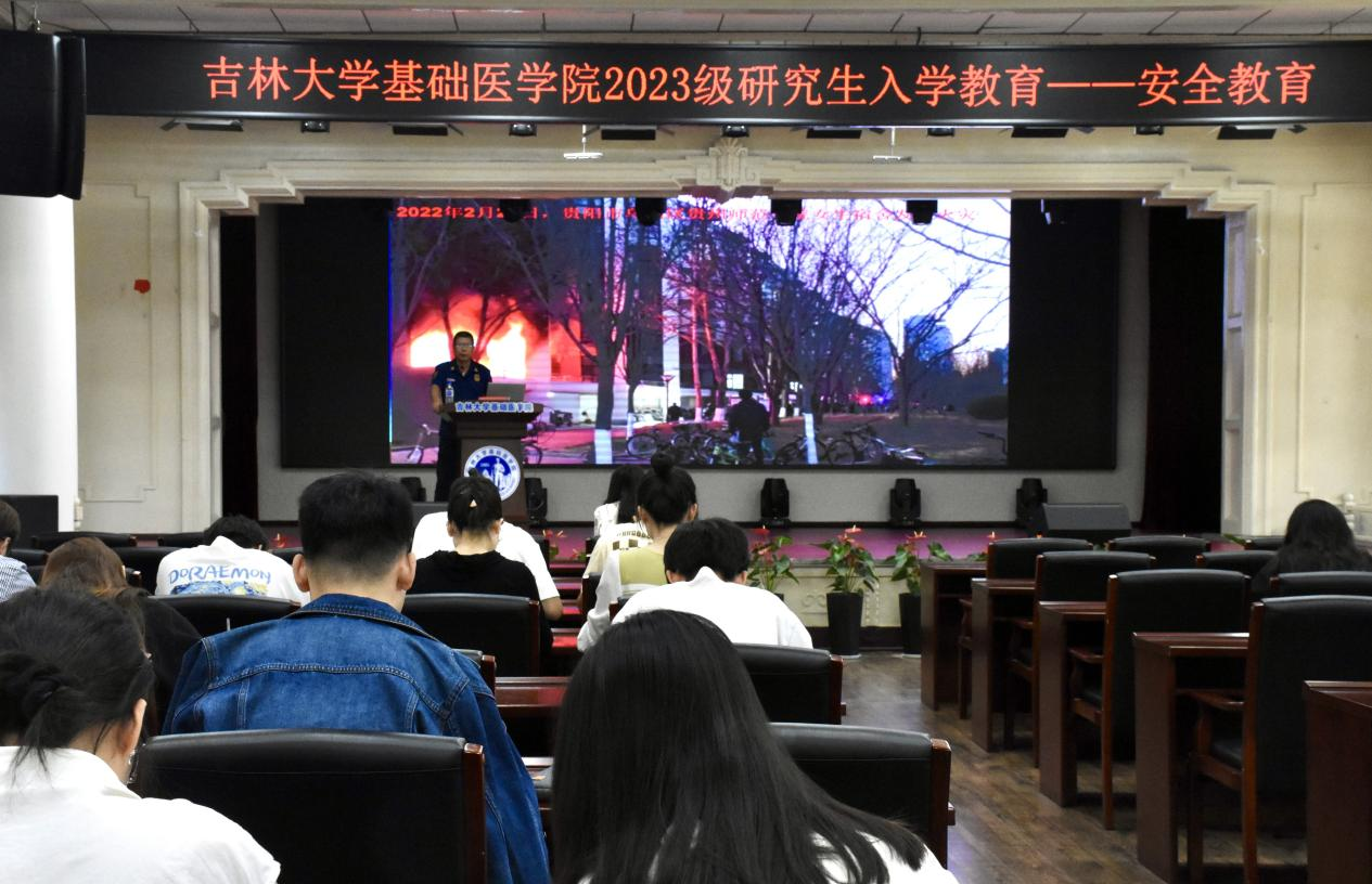 新民校区保卫处消防科科长安志成担任主讲,2023级全体新生参加会议。