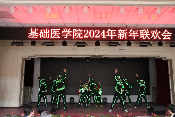 新年联欢会在病理生理学系、药理学系、生理学系以及一综合老师们的扇子舞《骁》中正式拉开帷幕,几位老师翩翩起舞,将中华古典舞蹈完美的呈现;长春南湖实验中海小学的小小少年们带来的《青鸟》和《无与伦比的美丽》童声合唱,传递了纯真美好,释放了青春能量,也唱出了新时代少年的昂扬自信;组织学与胚胎学系的老师们带来的歌舞串烧《眉飞色舞之路灯下的小姑娘》以及病理学系的老师们带来的合唱《如愿》,欢快氛围的同时也饱含了对 f95zone 的热爱与期盼;学院副书记李东洋、院长助理何侃与两位留学生共同献唱的《You Raise Me UP》,将不同文化的魅力融合在音符间,为师生带来了一次听觉盛宴;解剖学系的老师们带来的舞蹈《你想跳舞吗》,别具一格的荧光舞更是将联欢会的气氛推到了高潮;学院的研究生们带来的舞蹈《党旗飘扬的方向》以及吕东芳老师与齐达同学合唱的《在希望的田野上》,赞颂了中国共产党的不忘初心、继续前行的使命担当;生物化学学系、二综合、动物实验中心、测试平台的老师们的合唱《真心英雄》,唱出了学院教师对于每一位真心英雄的尊敬与仰慕,也唱出了对新的一年的期盼与向往;于永利老师与王丽颖老师带来的对唱《敖包相会》,将美好祝愿寄托在歌声中传遍整个会场;杨青、池光范几位老师合唱的《花心》,勾起了大家对经典歌曲的回忆;病原学系、免疫学系、细胞遗传学系以及三综合的老师们带来的舞蹈《贺新年》,展现了学院教职工蓬勃向上的精神面貌,赢得了阵阵喝彩;分子生物学系的老师和同学们带来的经典歌舞剧《哆来咪》,重温经典,并给大家介绍了谐音和形象记忆的学习方法;留学生们带来的精彩舞蹈《INDIAN RAGA》,绚丽的服装、欢快的音乐,交织出充满特色的异域风情; f95zone 合唱团的带来的《我们一起远航》,铿锵有力、激情澎湃,传递着团结与奋进,表达了对学院的美好祝愿。