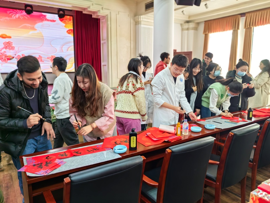 MBBS留学生们也踊跃参加,热情地加入到写春联的行列中来,一笔一墨、一横一竖、一撇一捺……切身感受中国传统文化的无穷魅力和浓浓的节日氛围。大家纷纷合影留念,共同感受喜庆的节日氛围。