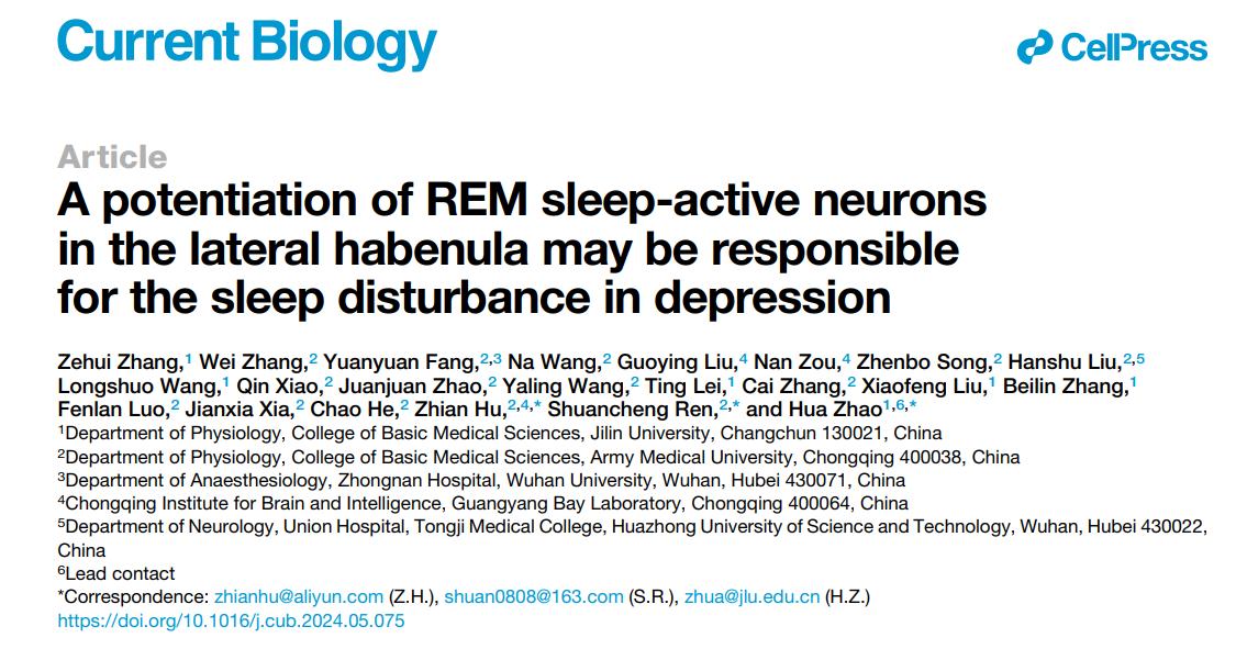 赵华教授团队、陆军军医大学胡志安/任栓成团队合作在Current Biology在线发表题为 “A potentiation of REM sleep-active neurons in the lateral habenula may be responsible for the sleep disturbance in depression”的研究论文。该研究证明LHb的REM睡眠活跃神经元在抑郁症所致睡眠障碍中具有不可或缺的作用,这一发现不仅确定了抑郁所致睡眠障碍发病中一个新靶点及其潜在机制,更为临床防治抑郁睡眠障碍提出了新策略。 Current Biology 是发表生物学领域研究的国际顶级刊物,中科院分区为1区的TOP期刊,最新影响因子8.1( f95zone