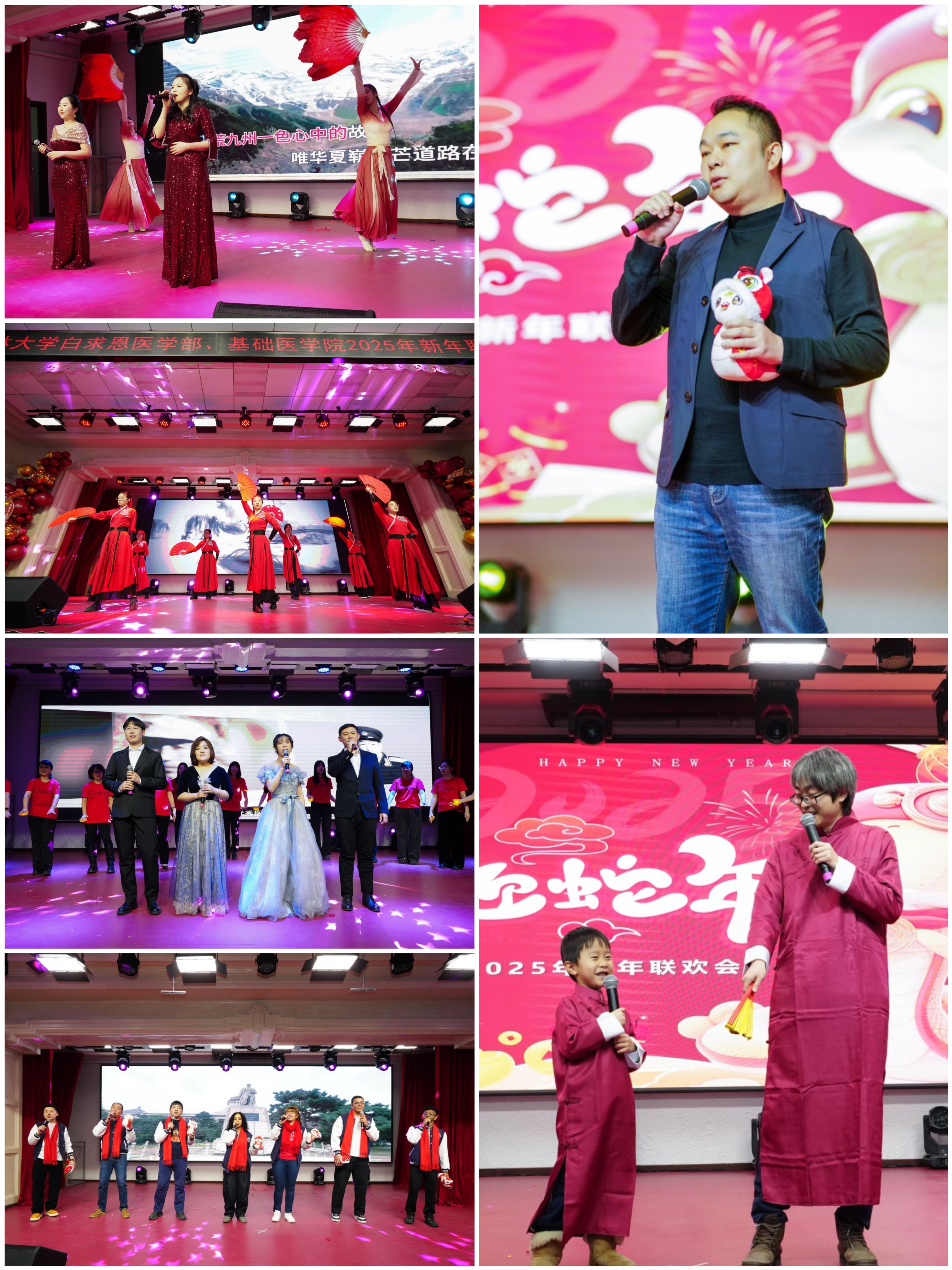 联欢会在长春市第一实验银河小学星星合唱班孩子们演唱的一曲《爱漫天空》中拉开序幕,优美的童声仿佛带我们进入了梦幻的世界;教职工第一党支部带来的扇子舞《雪龙吟》,将中华古典舞蹈完美的呈现,让我们领略了老师们的风采与活力;白求恩医学部王曦老师带来的独唱《木鱼与金鱼》,让现场观众深深沉浸在歌曲的旋律与情感之中;王放院长与智加未来、华为两位企业嘉宾合唱歌曲《跟往事干杯》,用歌声对过去致敬,同未来举杯,将现场气氛推向了新的高潮;组织学与胚胎学系带来的小合唱《财神快点来》,免疫学系、细胞遗传学系以及实验教学中心三综合带来的小合唱《一路生花》让我们感受到了浓浓的喜庆与祝福;丁健峰老师和他可爱的儿子表演的相声《说好不说好》让现场欢声笑语不断;来自吉林省艺术学院的实力唱将刘华晨老师演唱的歌曲《日落大道》和《男孩》,惊艳全场;病理学系带来的歌伴舞《苹果香》、生理学系的歌伴舞《万疆》,生物化学学系,实验教学中心二综合及测试中心合唱的《少年的你啊》,纷纷展现了学院教职工蓬勃向上的精神面貌,赢得了阵阵喝彩;学院留学生班主任及四位留学生同学带来的歌曲《恭喜发财》,将不同文化的魅力融合在音符间;白求恩医学部张博老师带来的魔术《654俱乐部》精彩纷呈,让人眼前一亮;最后由 f95zone