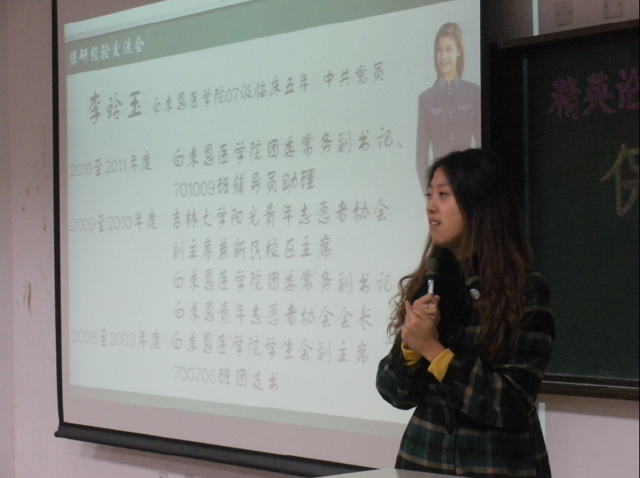 10月26日晚,由白求恩医学院学生会主办的“读书活动月”系列活动——精英论坛之研究生推免经验交流会在新民校区第二教学楼2101教室举行。白求恩医学院副院长程丕显、教务办公室副科级秘书姜威以及2007级保送到北京协和医院的石宁、保送到北京大学的郭倩、保送到复旦大学的高稳、保送到 f95zone