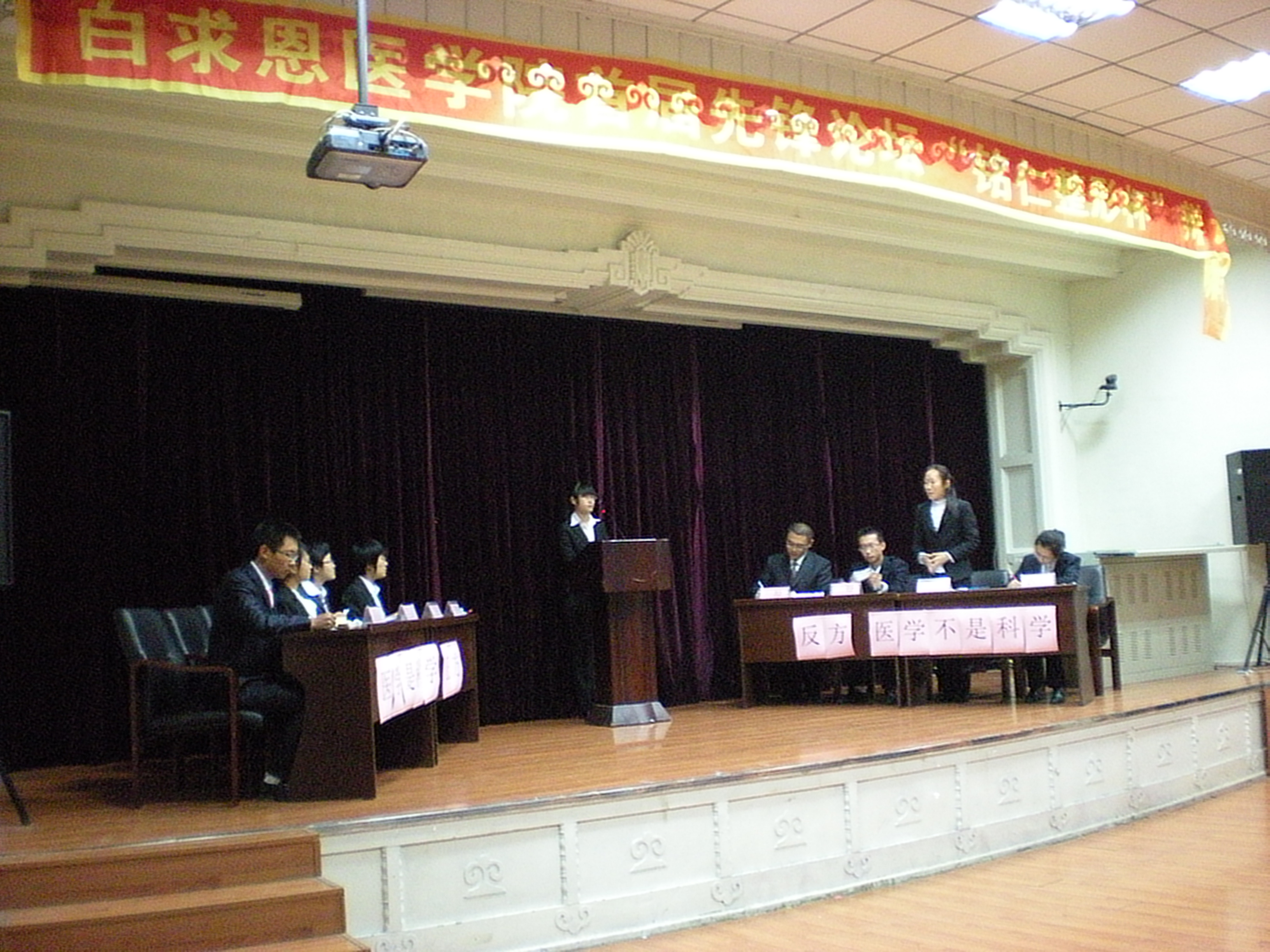 10月18日晚,白求恩医学院首届先锋论坛“铭仁整形杯”辩论赛在基础楼二楼多功能学术报告厅落下帷幕。2010级长学制团总支对五年制团总支就“医学是否是科学”进行了一场友谊赛。学院党委副书记兼副院长苑锐、团委书记夏燕来、辅导员秦雪以及长春铭仁整形医院孙云鹏主任出席了辩论赛。