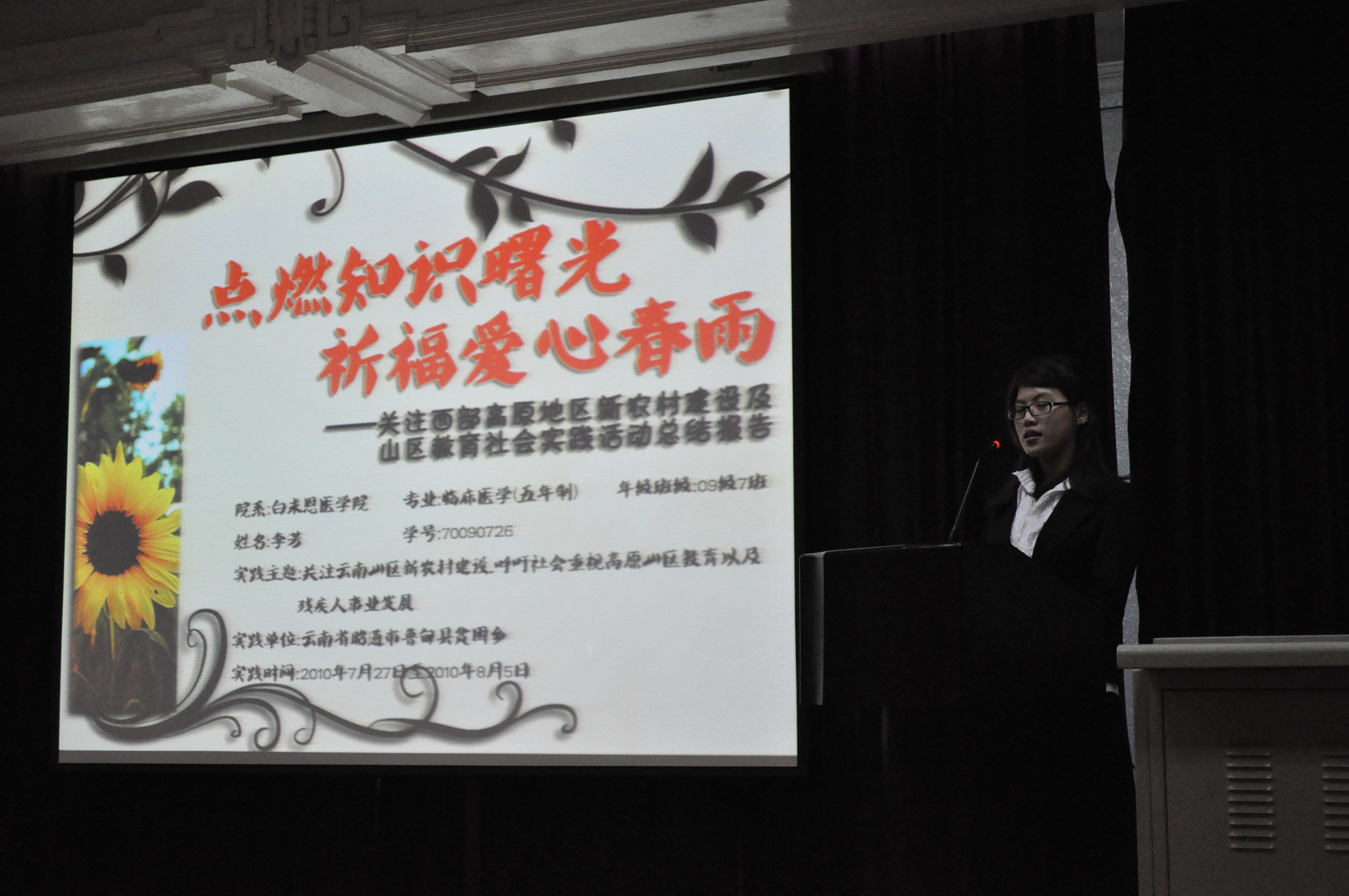 首先,团委副书记李玲玉对2010年暑期社会实践活动进行了总结,团委副书记李梓萌对扶残助残和残疾人调研专项活动做了汇报。白求恩医学院本年度的社会实践工作部署早,参与面广,效果明显,涌现出了一批优秀团队和先进个人,撰写了一批高质量的社会实践报告。在表彰大会上,11位获奖代表先后就自己的暑期社会实践做了精彩的发言。才仁卓嘎回到玉树家乡用志愿服务传递永恒的白求恩精神;张滨、林萍等人组成的寻根之旅为牛眼沟村白求恩希望小学的孩子们插上了理想的翅膀;李芳独闯西部高原引发了深深的思索;孟凡会、关伟的残疾人调研小分队搜集了大量详实的资料;周玄博的启智培训学校之行告诉我们知福、惜福、再造福;曲垠梦、牟胜男分别为敬老院带去欢乐与关怀。获得特别贡献奖的牛眼沟村支教团指导教师张纪周也讲述了自己的感受与体会。